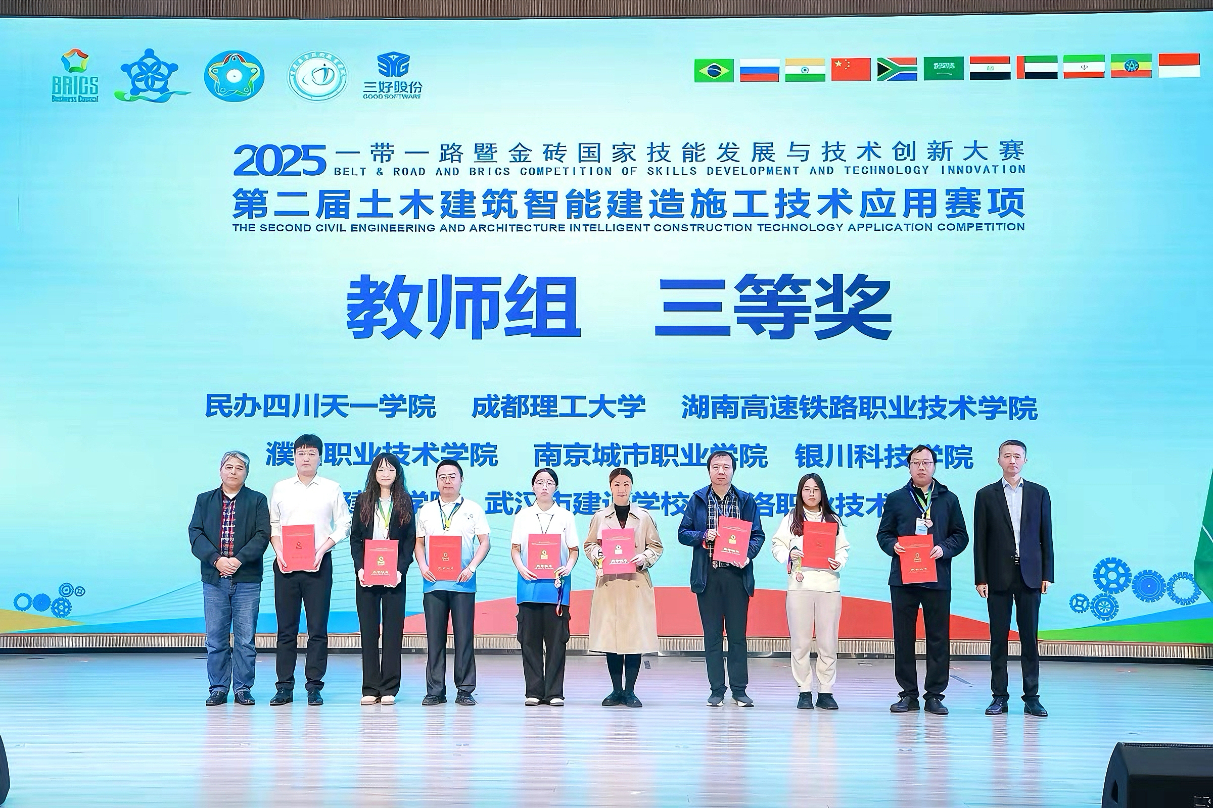 10月19日,2025“一带一路”暨金砖国家技能发展与技术创新大赛第二届土木建筑智能建造施工技术应用赛项总决赛在重庆安全技术职业学院圆满落幕。大赛首次举行教师组教学能力比赛,我校康养工程学院周康、于露老师喜获三等奖。