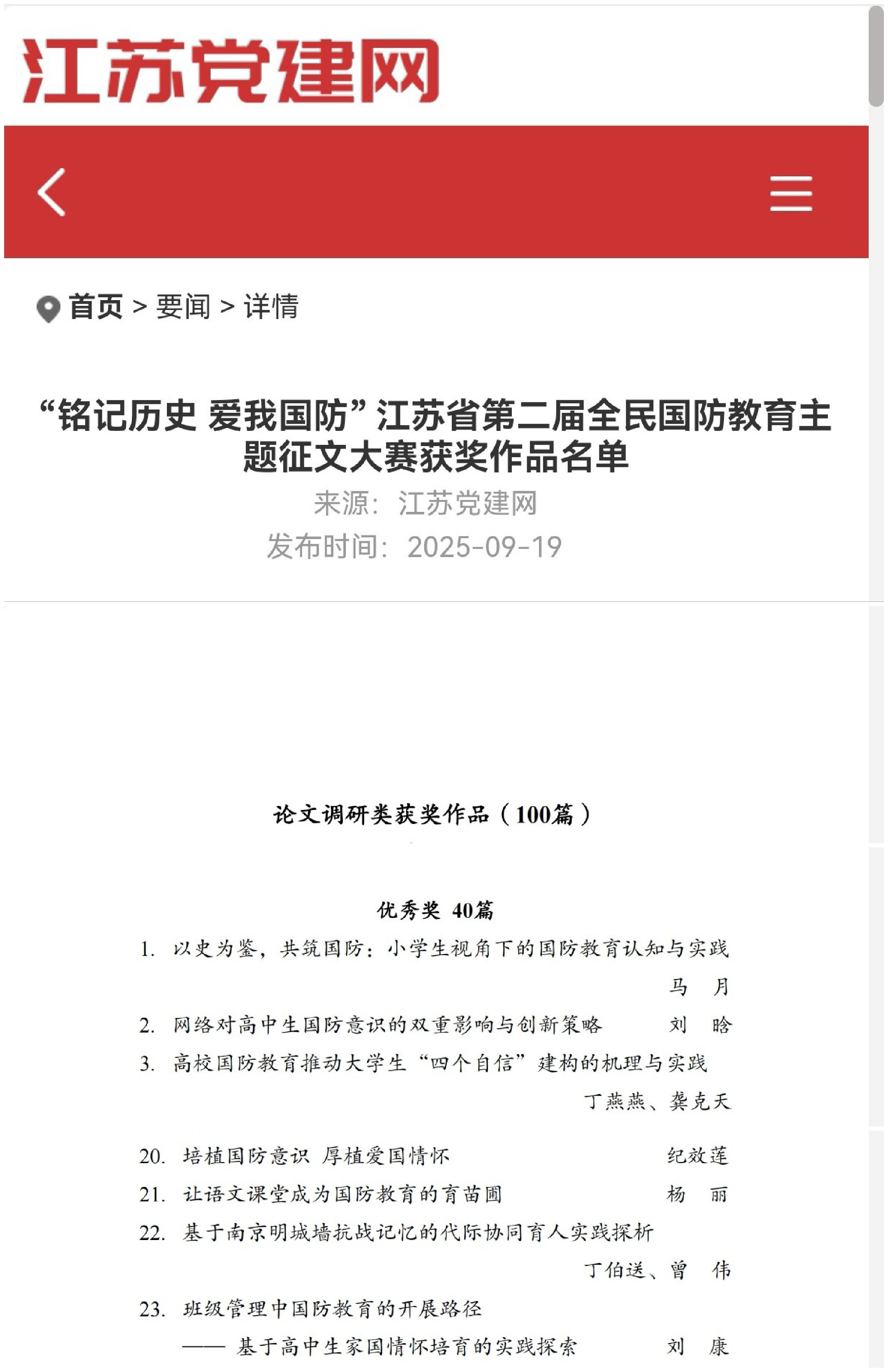 赛事启动以来,学校积极组织师生参与,累计征集作品20篇。其中,丁伯送、曾伟两位老师合作撰写的理论研究论文《基于南京明城墙抗战记忆的代际协同育人实践探析》荣获大赛优秀奖。