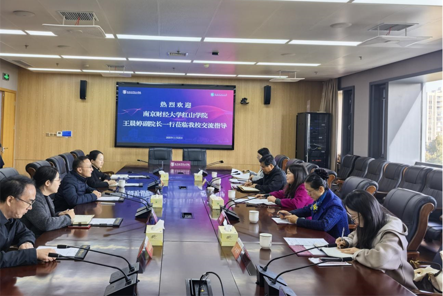 为深化校际合作,共享办学经验,11月25日,南京财经大学红山学院党委副书记、副院长王晨婷带队,携会计学院院长孟翠湖,工商管理学院党总支书记、院长张太海,工商管理学院党总支副书记王海萍以及会计学院党总支副书记王颖赴我校开展交流座谈。副校长陈正宇,数字财商学院党总支书记、院长滕静涛,数字财商学院党总支副书记邓莹以及教研室教师热情接待并参与交流。