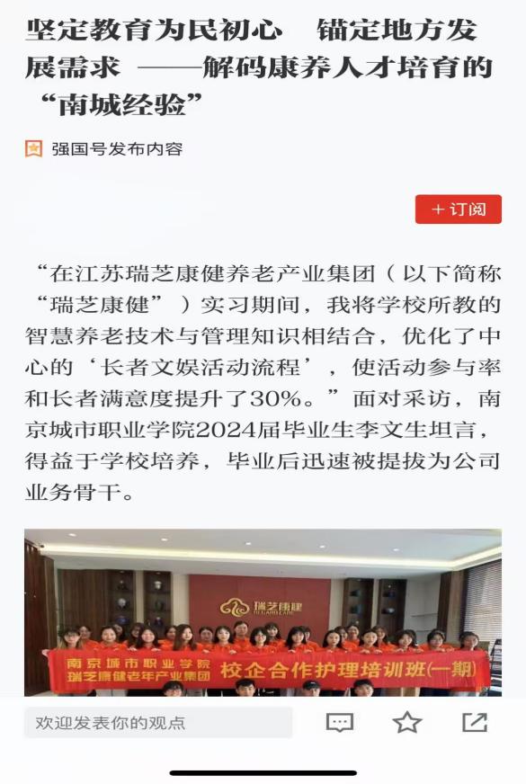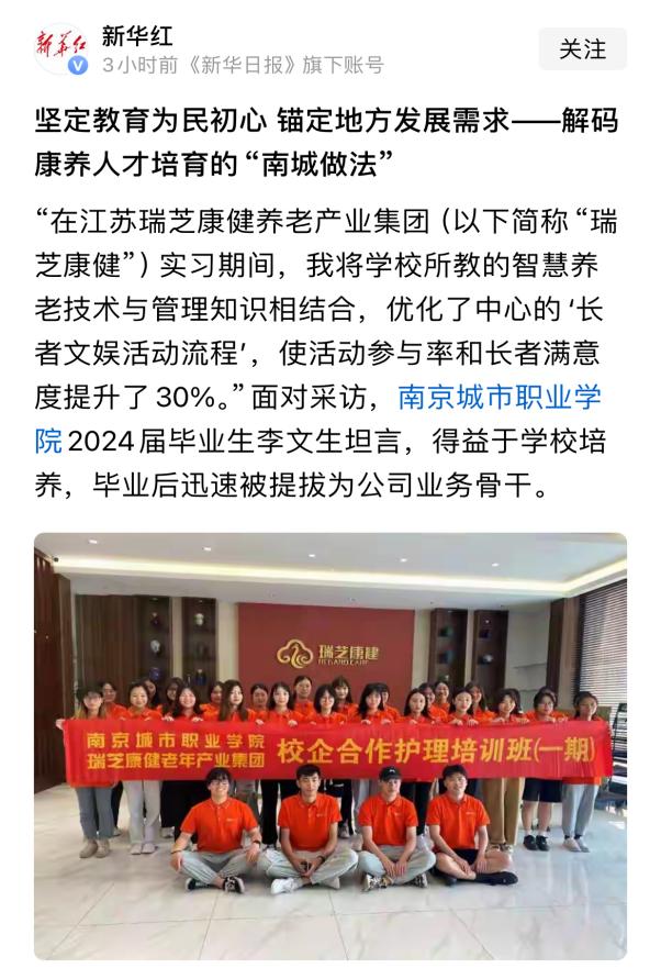 多家主流媒体对学校康养人才培育经验的聚焦,既是对“校地融生、产教融合”路径的肯定,更是对新时代职业教育高质量发展的鞭策。学校将持续深化教育为民初心,为服务南京“4266”现代产业体系与溧水区健康产业集聚区建设注入新动能。
