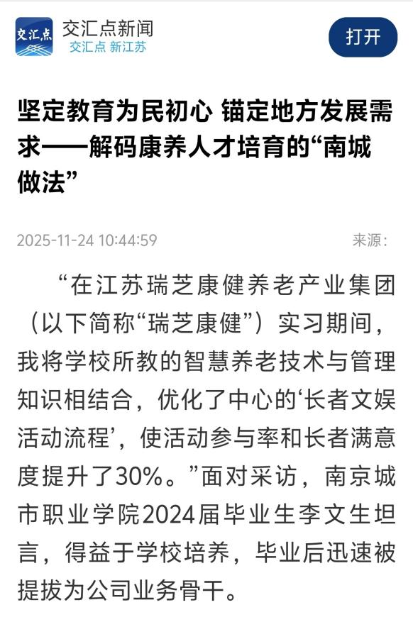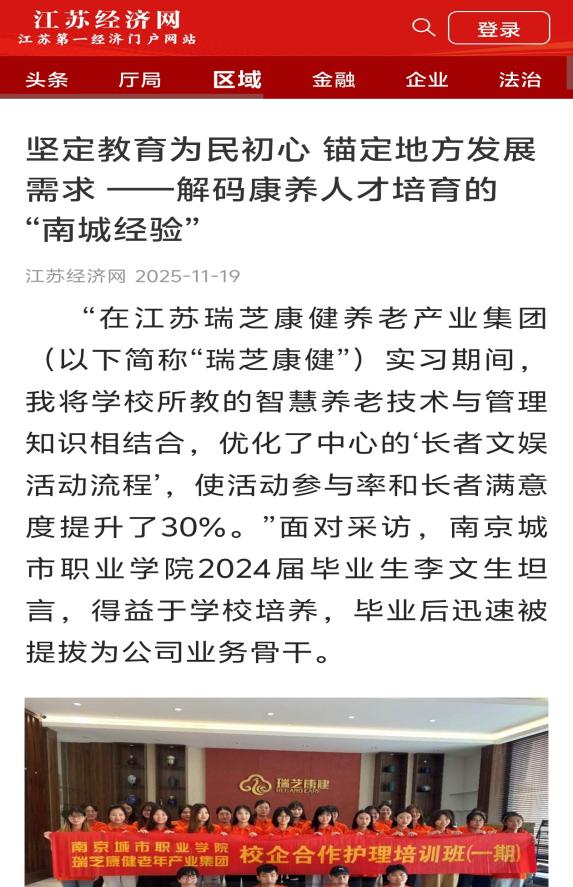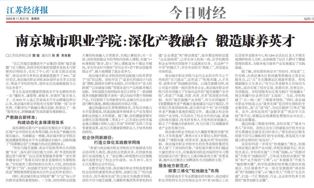 近日,《新华日报》《江苏经济报》和“学习强国”“交汇点新闻”等多家主流媒体先后刊发《坚定教育为民初心 锚定地方发展需求——解码康养人才培育的“南城经验”》专题报道,深度解析我校康养工程学院在服务区域发展、创新人才培养模式方面的实践成果。报道从产教融合、校企协同、服务地方三个维度,系统梳理了学校紧扣“健康中国”战略、加快构建康养人才培育高地的特色路径,引发社会广泛关注。