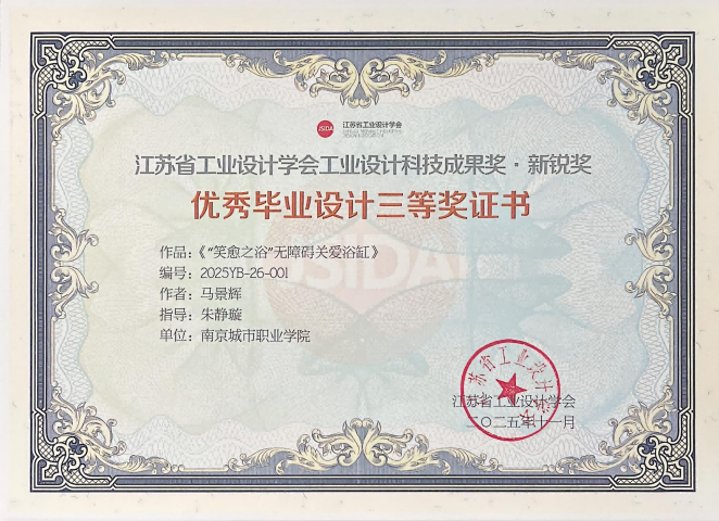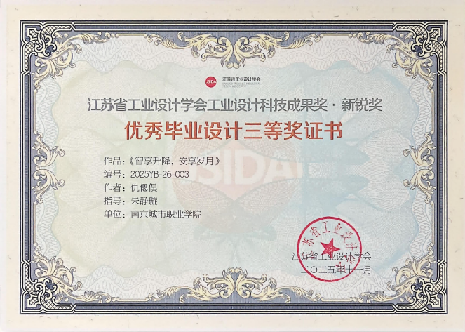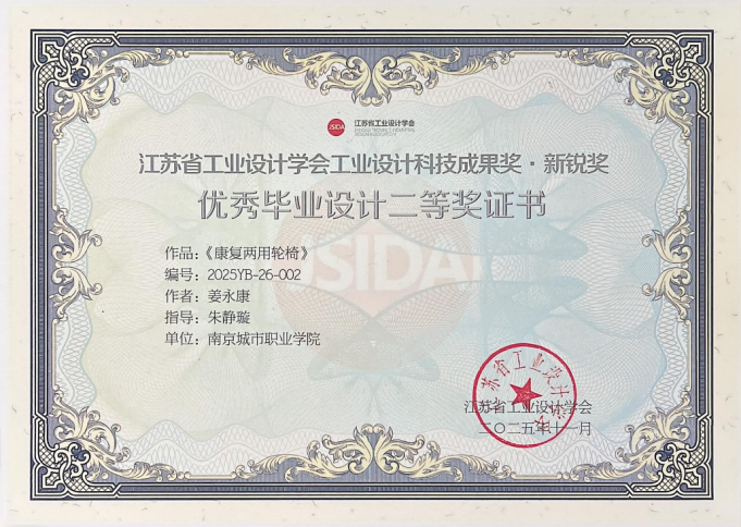 与此同时,由我校数字文创学院产品艺术设计专任教师朱静璇指导的2025届毕业生设计作品,在江苏省工业设计学会主办的2025年优秀毕业设计奖评选中斩获佳绩。姜永康、马景辉、仇偲俣同学分别以作品《康复两用轮椅》《“笑愈之浴”无障碍关爱浴缸》和《智享升降,安享岁月》参赛,凭借其创新性、人文关怀与实用价值,荣获江苏省工业设计学会“工业设计科技成果奖·新锐奖”二等奖一项、三等奖两项,充分展现了我我校学子扎实的专业能力、敏锐的设计思维与强烈的社会责任感。