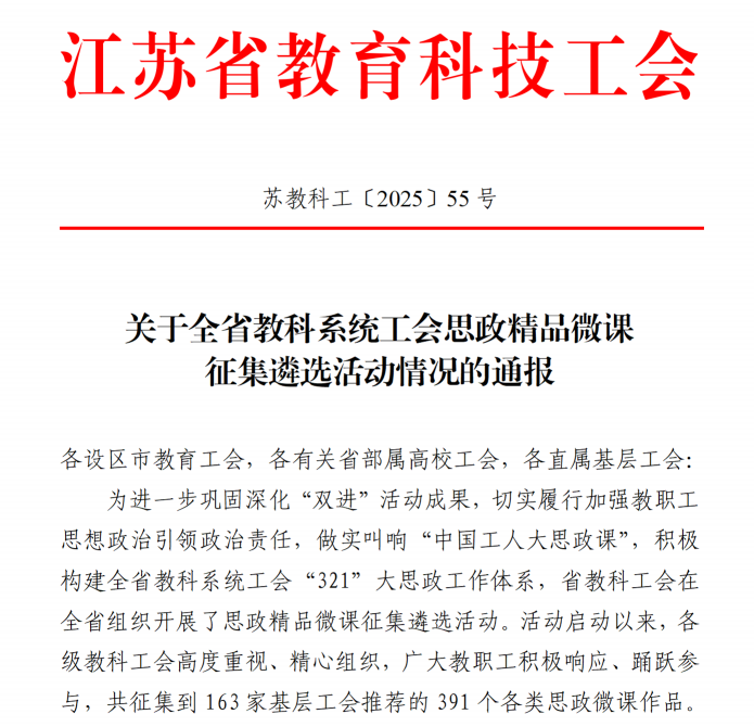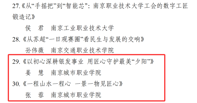 近日,江苏省教育科技工会发布《关于全省教科系统工会思政精品微课征集遴选活动情况的通报》,我校工会选送的姜慧老师《以初心深耕银发事业 用匠心守护最美“夕阳”》和张蓉老师《一程山水一程心 一景一物见匠心》两部作品双双荣获“2025年全省教科系统工会思政精品微课”称号。