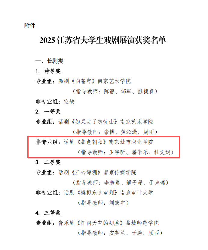近日,由中共江苏省委宣传部、江苏省教育厅、共青团江苏省委主办,江苏省戏剧家协会、江苏大剧院、江苏省大学生艺术团联合会承办的2025江苏省大学生戏剧展演获奖名单公布,我校大学生艺术团创排的原创话剧《暮色朝阳》在众多参赛作品中脱颖而出,荣获长剧类非专业组一等奖。