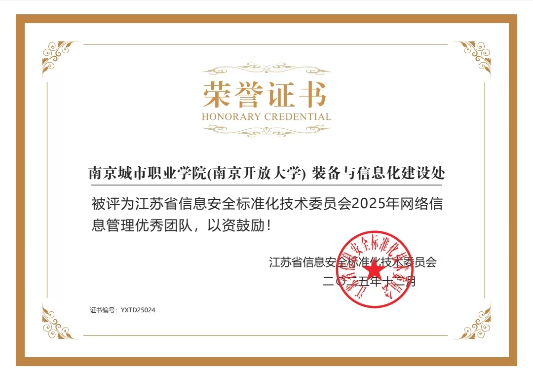 近日,江苏省信息安全标准化技术委员会公布2025年网络信息管理优秀团队评选结果,南京城市职业学院(南京开放大学)装备与信息化建设处凭借扎实的工作成效和专业的服务能力,成功获评该荣誉称号。