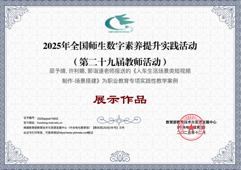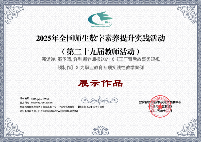 近日,由教育部教育技术与资源发展中心主办的2025年全国师生数字素养提升实践活动评选结果正式揭晓,我校数字财商学院郭诣遂、许利娜、邵予晴老师报送的三项实践性教学案例作品获评职业教育专项展示作品。