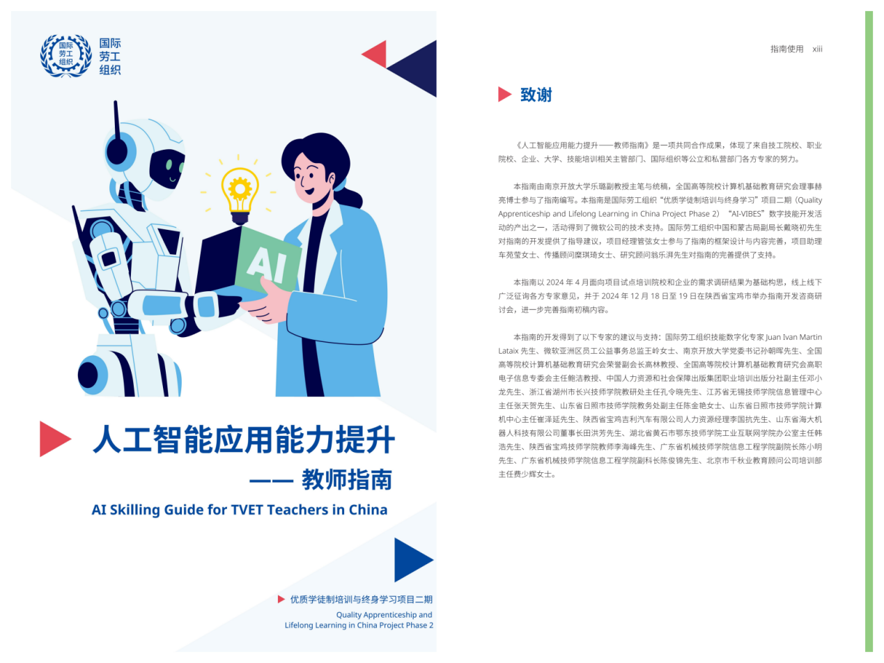 近日,我校智能工程学院副教授乐璐主笔与统稿的《人工智能应用能力提升——教师指南》在联合国机构国际劳工组织(ILO)官网正式发布,标志着我校在人工智能赋能职业教育领域的探索获得国际组织认可。该指南是国际劳工组织“优质学徒制培训与终身学习项目(二期)”的重要成果之一,主要面向职业教育与培训领域教师,旨在帮助教师提升人工智能工具在教学、培训与技能发展中的应用能力,推动人工智能技术在职业教育领域的规范化与实践化应用。