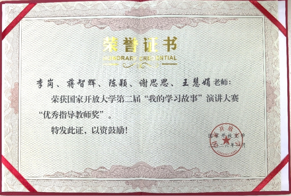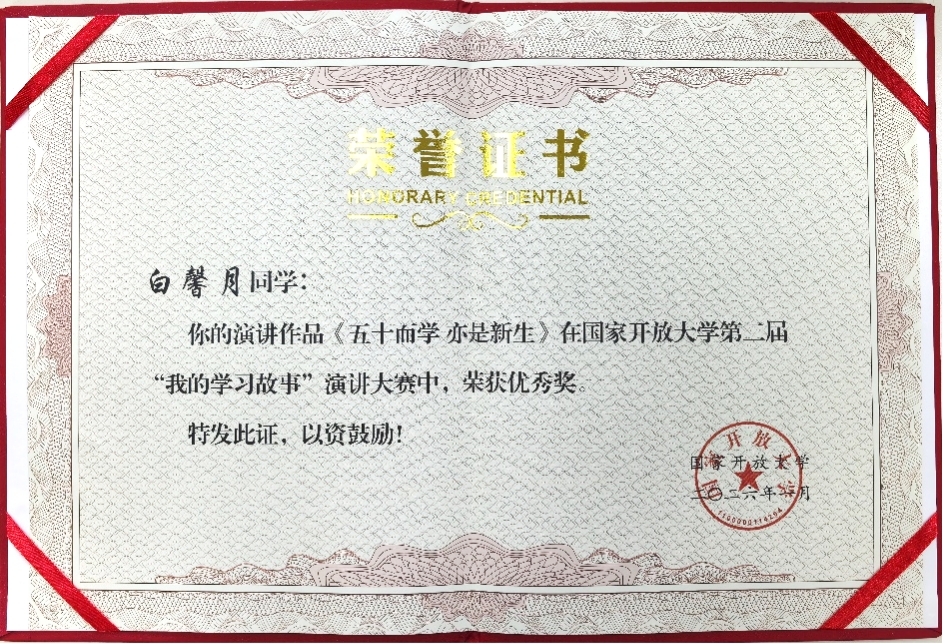 近日,国家开放大学第二届“我的学习故事”演讲大赛评选结果正式揭晓,我校浦口开放大学学子白馨月凭借作品《五十而学,亦是新生》喜获大赛优秀奖。浦口学习中心李岗、蒋智辉、陈颖、谢思思、王慧娟五位老师获评“优秀指导教师奖”。