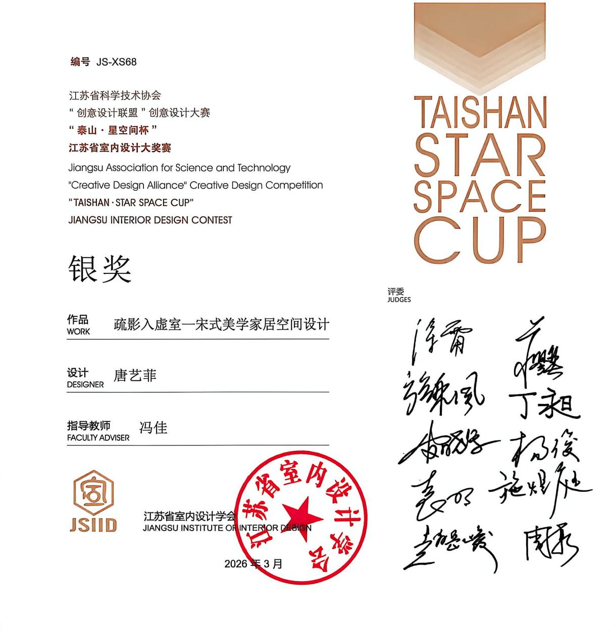 3月30日,由江苏省室内设计学会主办的第十六届“泰山・星空间杯”室内设计大赛评选结果正式揭晓。我校数字文创学院冯佳老师指导的环境艺术设计专业唐艺菲同学凭借出色的专业素养与创新设计能力获得室内设计组银奖。