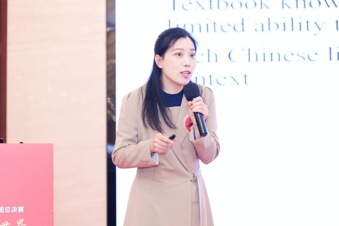 总决赛现场,潘敏、支婷婷两位老师分别进行5分钟教学设计介绍和10分钟课堂教学展示,随后对评委的现场提问分别作答。团队在大赛指定教材中选取Traveling主题单元,结合网络营销与直播电商专业人才培养需求,将行业场景融入课堂,生动展示了高职英语课程融合数字技术、深耕课程思政育人的创新实践。