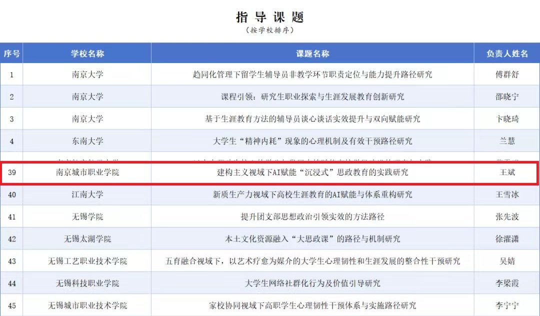 智能工程学院辅导员李莉老师撰写的工作案例《从“逃离产线”到“准工匠”:双向赋能三阶递进的高职学生职业认同干预实践》,在全省百余所高校参评案例中脱颖而出,荣获一等奖。数字文创学院辅导员王斌老师申报的《建构主义视域下AI赋能“沉浸式”思政教育的实践研究》获批指导课题立项。